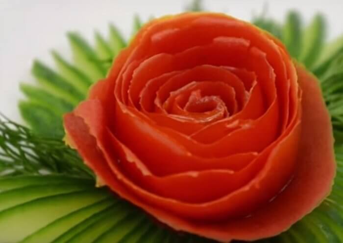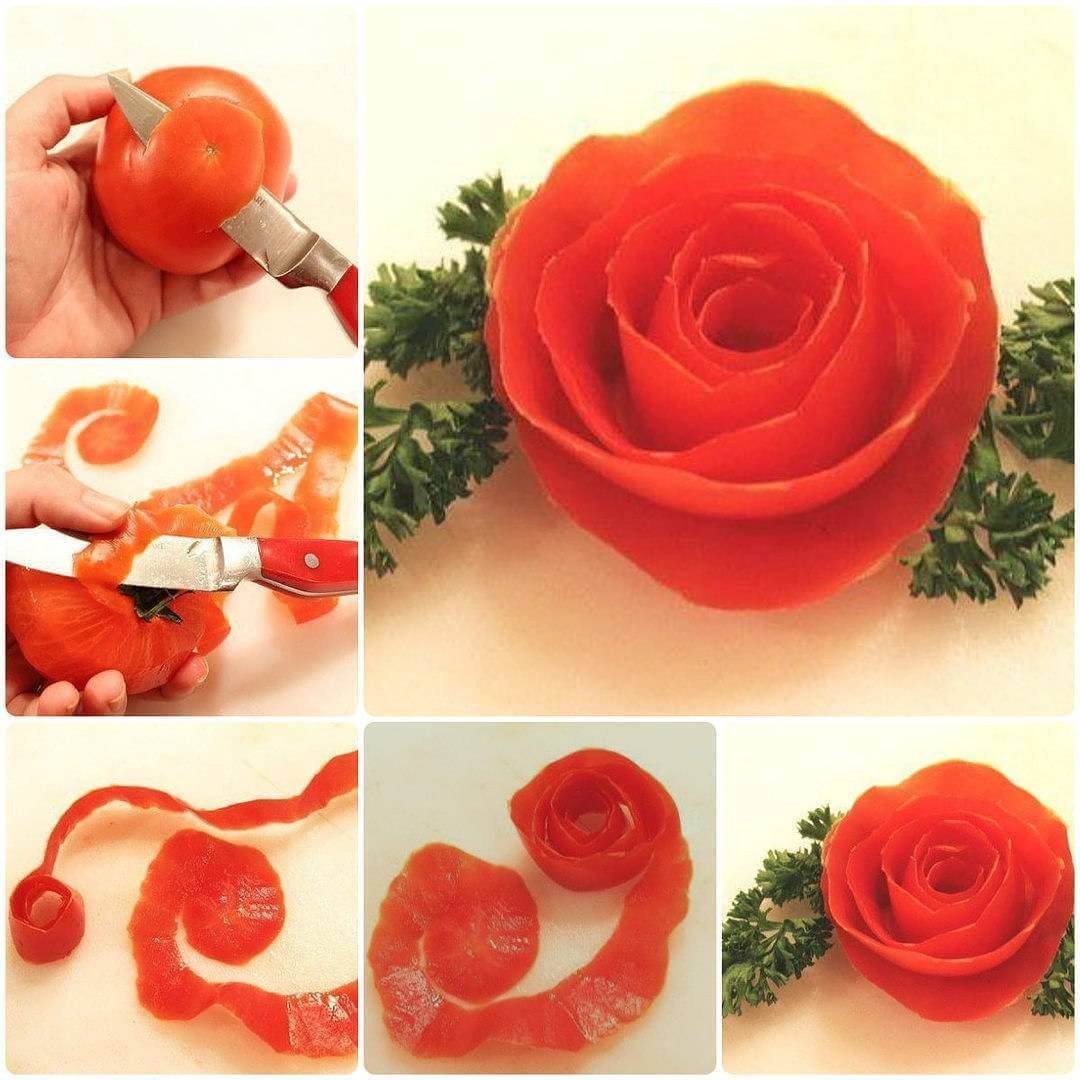 Возьмите себе на заметку эту красивую идею изготовления розы из помидора для украшения праздничных блюд.