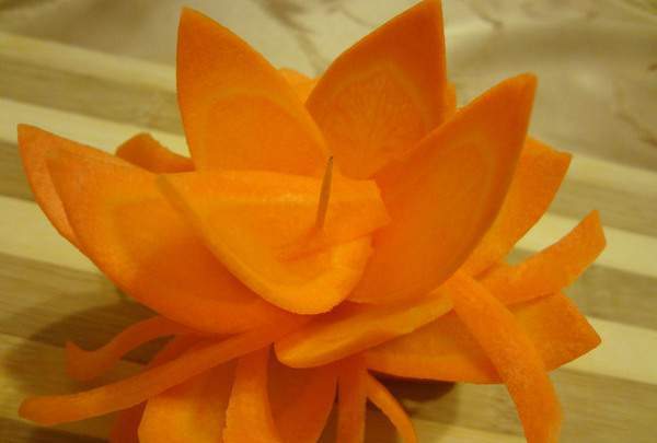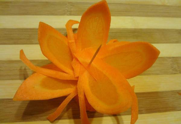 11. Если вам удобно приготовить морковные цветы для украшения заранее, опустите их в раствор холодной воды с солью и уксусом. В таком рассоле они надолго сохранят свежий вид и яркий цвет, чтобы впоследствии радовать глаз на столе в виде оригинальной яркой закуски.