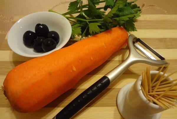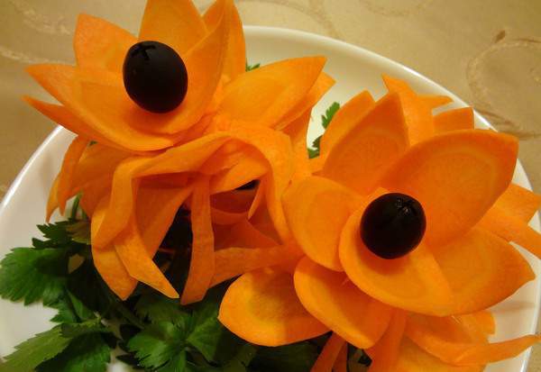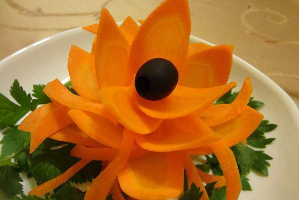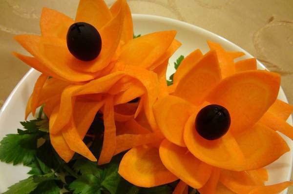 10. На самый кончик зубочистки вверху прикрепите черную оливку. Можно заменить ее зеленой оливкой или любой красной ягодой. Готовые морковные цветы выложите на блюдо с салатом и украсьте зеленью.