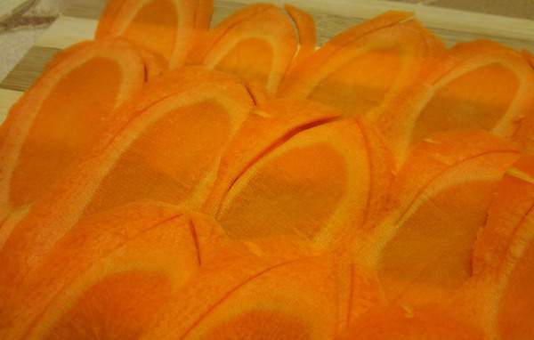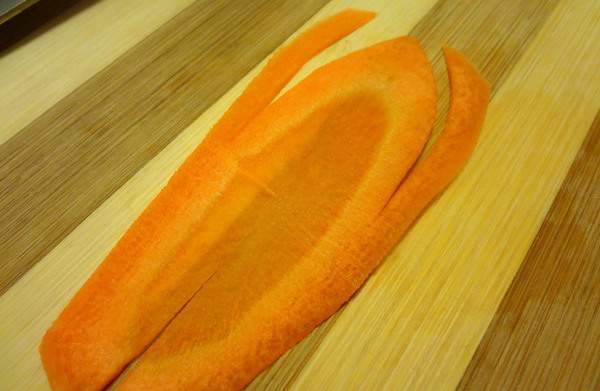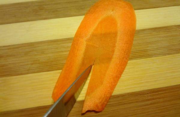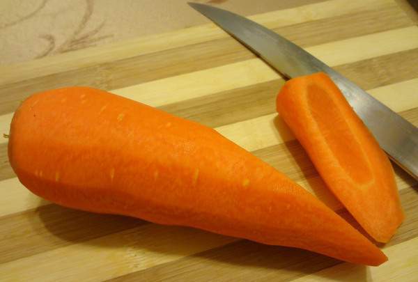 1. Очистите морковь, вымойте ее, обсушите при помощи бумажного полотенца. Отрежьте ножом нижнюю часть моркови по диагонали.