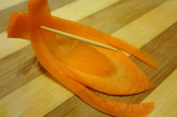 7. Для удобства закрепите зубочистку на оставшихся обрезках моркови и продолжайте нанизывать на нее лепестки, аналогично первому.