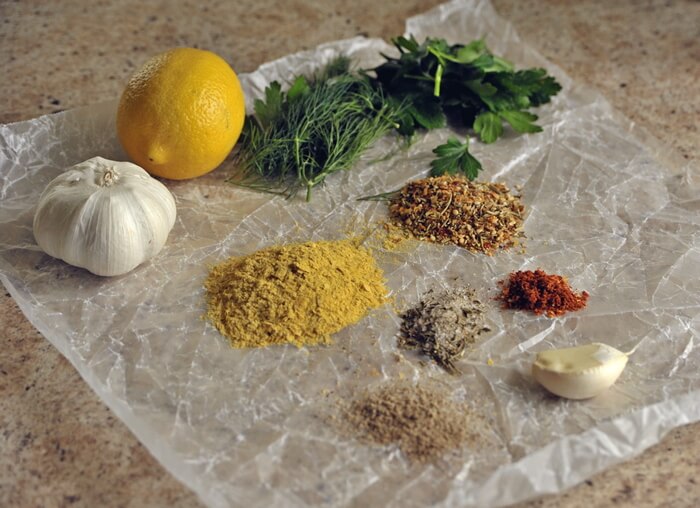 1.Зелень укропа и петрушки вымойте, обсушите на бумажном полотенце и мелко нарежьте. Чеснок разделите на зубчики, очистите от шелухи, мелко нарежьте или пропустите через пресс.