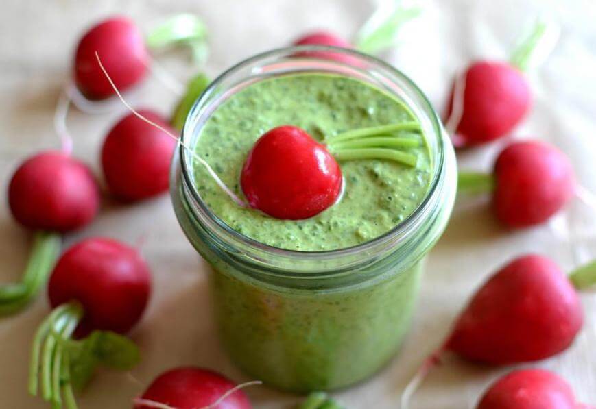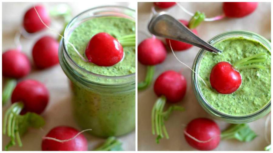 7. Готовый веганский соус песто с листьями редиса переложите из чаши блендера в стеклянную банку и поставьте в холодильник, где он может храниться несколько дней.