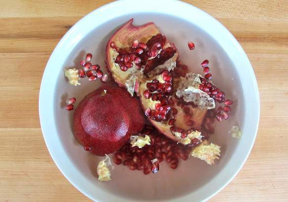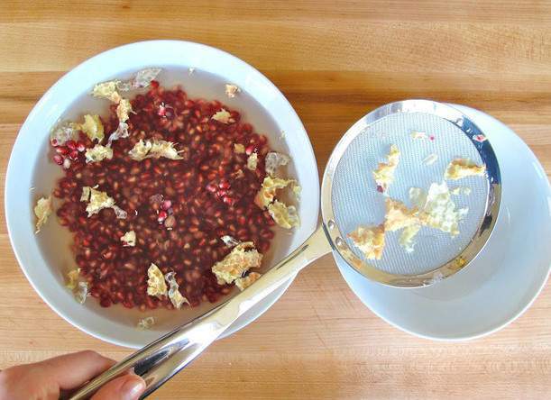 7. Разламывая под водой перегородки секций, высвобождайте зерна. Они будут опускаться на дно миски. А легкие перегородки сердцевины будут подниматься наверх, как поплавки. Освободив все зерна, удалите из миски с водой кожуру и большие куски перегородок.