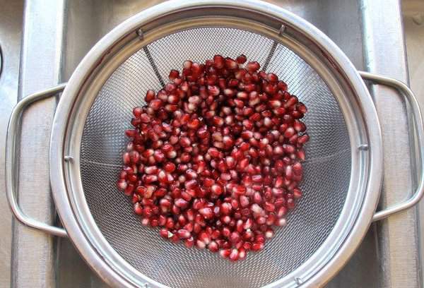 9. Откиньте семена из миски на дуршлаг, просмотрите, не остались ли среди зерен кусочки сердцевины, и удалите их. Зерна граната готовы к дальнейшему использованию в приготовлении блюд.
