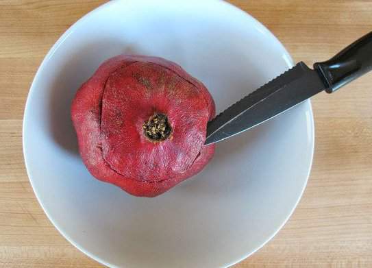 1. Сделайте неглубокий надрез ножом со стороны стебля в верхней части граната, называемой короной. Вырежьте по периметру верхнюю часть кожуры, создавая неглубокий круг. Не толкайте нож слишком глубоко, чтобы не повредить крайние зерна.