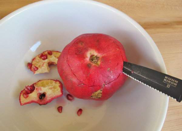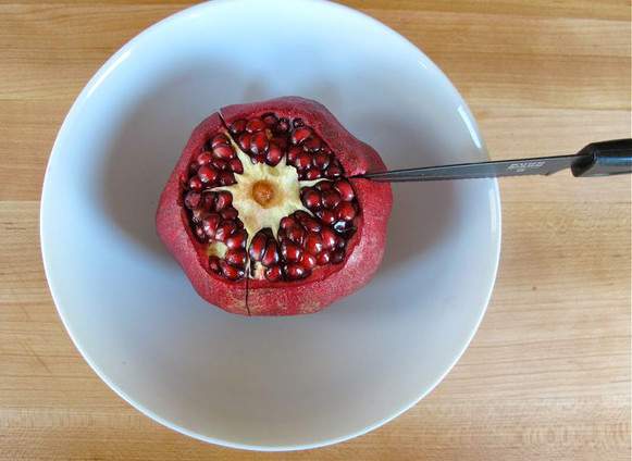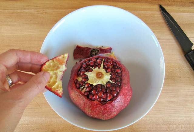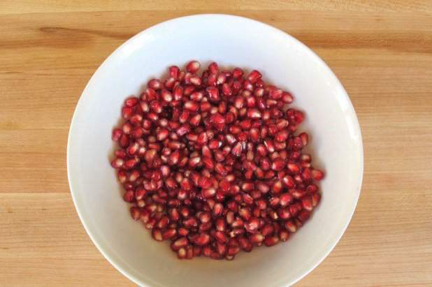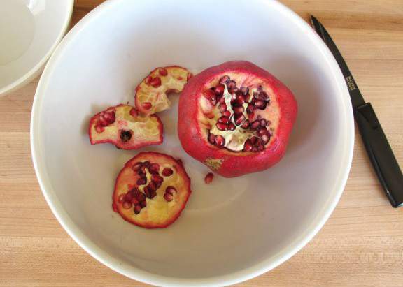 8. Осторожно ослабьте семена у перегородок сердцевины и поместите их в чистую маленькую миску. Держите наготове цветное кухонное полотенце, чтобы вытирать брызги сока, который может вытечь из семян. Осторожно – гранатовый сок может окрасить достаточно сильно.
