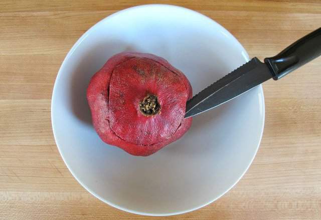 6. Переверните гранат обратно в первоначальное положение. Вы увидите шесть белых полос сердцевины из середины до краев плода. Сделайте ножом прорези в боковой части кожуры, следуя от линий сердцевины сверху вниз, до дна плода.