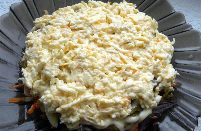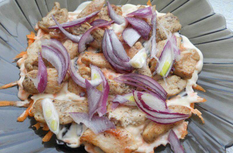 3. После остывания выложите курятину на морковную массу, а на нее – очищенный и тонко нарезанный перьями красный лук. Огурцы нарежьте соломкой, уложите на лук и смажьте майонезом.