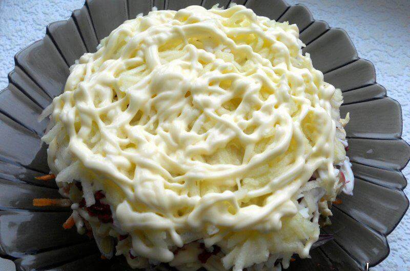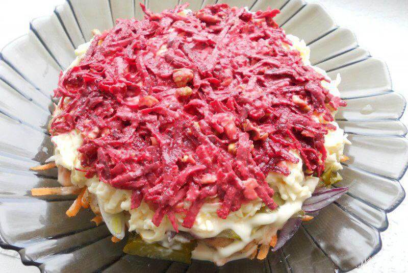 5. Свёклу очистите от кожуры, натрите на крупной терке, смешайте с растолченными орехами, майонезом и выложите на сырный слой. На слой свёклы уложите слой тертых яблок, смешанных с тертыми белками и смажьте сверху майонезом.