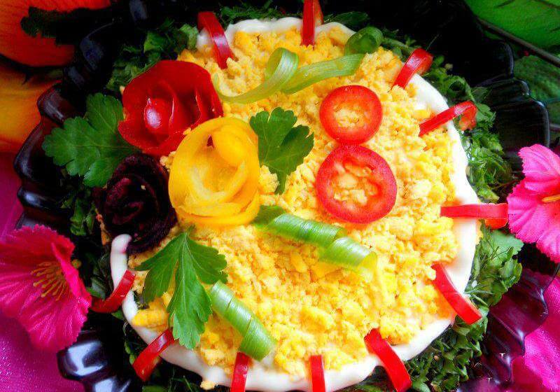 6. Желтки яиц натрите на мелкой терке и посыпьте ими салат сверху. Зелень, оставив несколько листиков, мелко порубите и обсыпьте ею бока салата. Украсьте по периметру нарезанным красным перцем.
