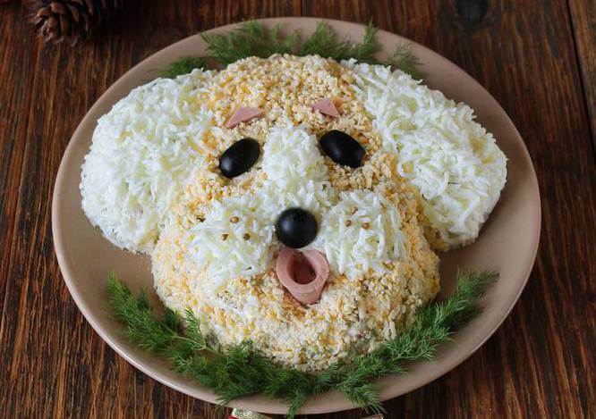 2. На плоском праздничном блюде из тертого картофеля выложите основу салата в форме головы собаки – вертикальный овал, расширенный книзу как груша с «каплями» ушей по бокам.