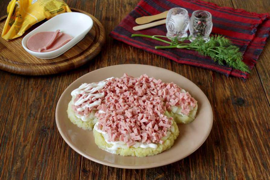 4. Колбасу нарежьте мелкими кубиками, выложите следующим слоем. Приправьте перцем по желанию и смажьте майонезом. Вместо вареной колбасы можете использовать копчености или вареное мясо.