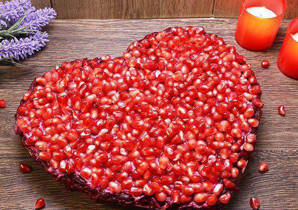 9. Завершающий слой – зерна граната. Салат «Гранатовое сердце» с курицей и орехами готов. Пора подавать к столу.