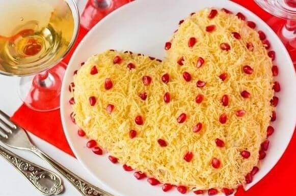 8. Натрите твердый сыр на средней терке и уложите на яйца с майонезом завершающим слоем. Украсьте полученное сердце зернами граната.