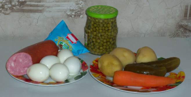 1. Подготовьте все необходимые для салата ингредиенты. Картофель и морковь отварите до готовности, охладите при комнатной температуре и очистите от кожуры. Яйца отварите вкрутую, остудите в холодной воде и очистите от скорлупы.