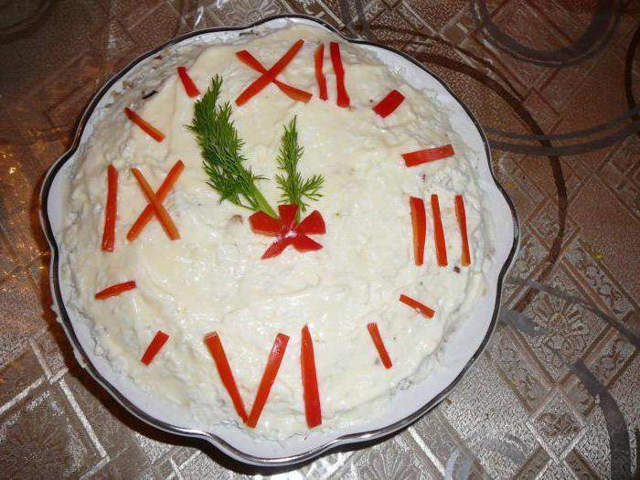Салат «Новогодние часы» с курицей, черносливом и орехами оформляется слоями и украшается изображением циферблата часов со стрелками, указывающими на без пяти минут двенадцать. Смотрите также другие рецепты на новый год 2020.