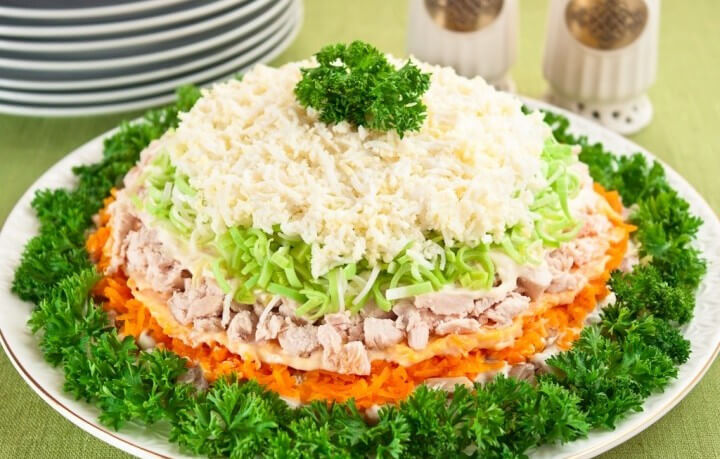 5.Украсьте салат зеленью петрушки и поставьте на блюде в холодильник на 2-3 часа, чтобы все вкусы и ароматы соединились в единое целое.