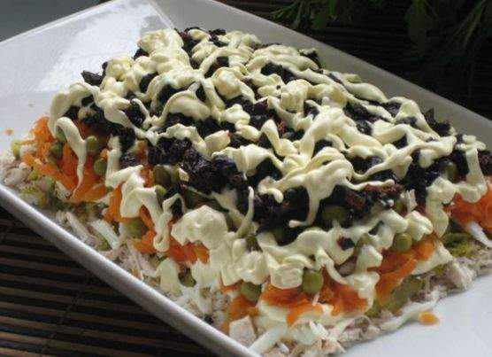 11. Аккуратно выложите слои салата на блюде, промазывая майонезом каждый слой. Порядок слоев следующий: курятина – маринованный лук – яйца – огурцы – морковь – зеленый горошек. Сверху разложите чернослив и украсьте его сеточкой из майонеза.