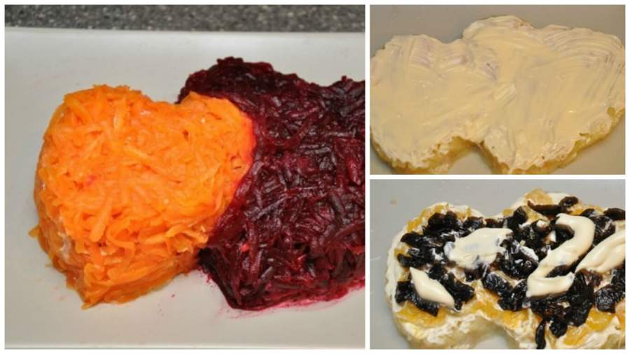 8. Следующий слой – апельсиновый, затем – чернослив. Смажьте слои майонезом и накройте последним слоем. Сердце, что побольше, украсьте свеклой, а то, что поменьше – морковью.
