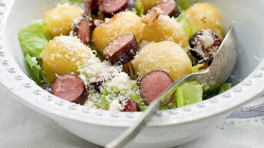 5. В глубокую миску сложите тёплый картофель, поджаренную колбасу с луком, треть тертого пармезана салат. Перемешайте. Полейте заправкой и снова аккуратно перемешайте.