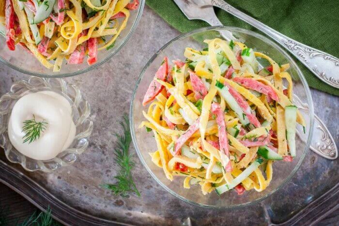Готовим салат из яичных блинов с салями и огурцами