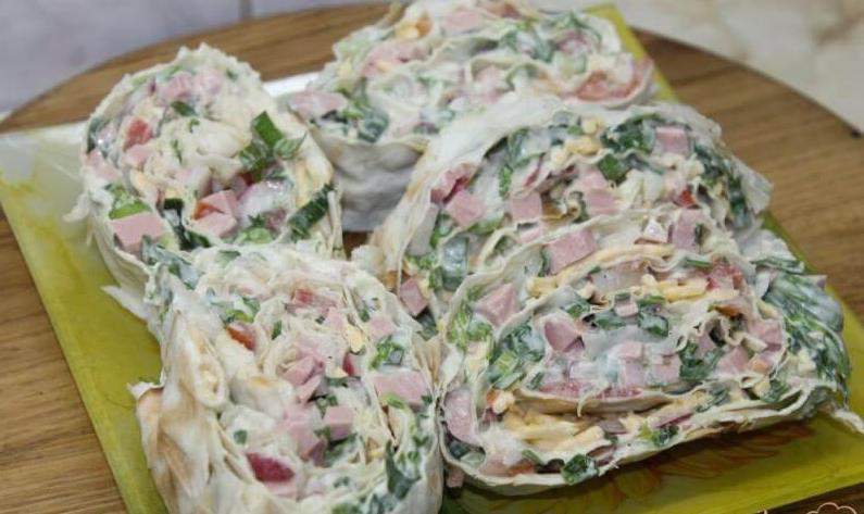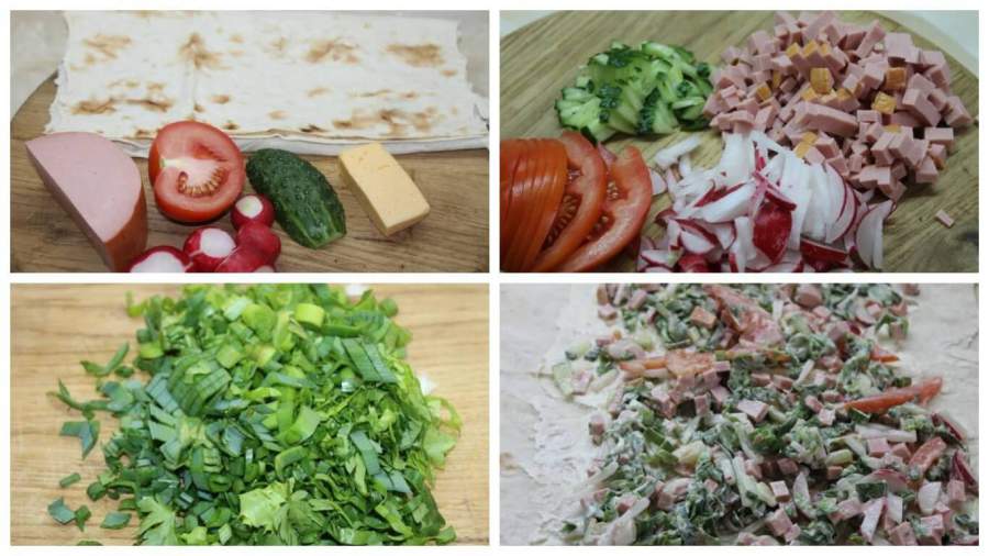 Готовим салат с колбасой, овощами и сыром в лаваше