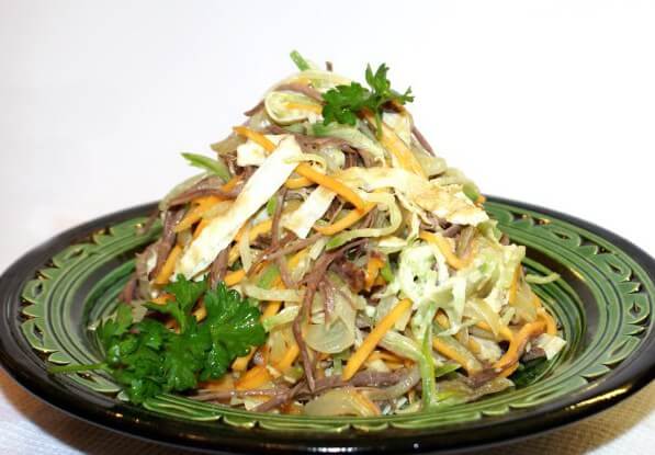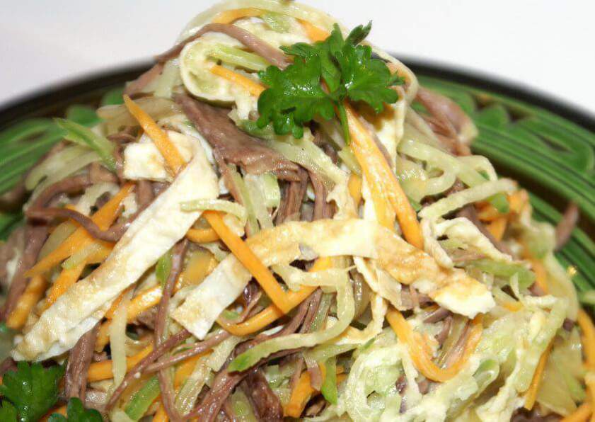 7. Приготовленный мясной салат с зеленой редькой и блинчиками поставьте в холодильник минут на 30, чтобы настоялся и пропитался вкусами, а затем подайте к столу.