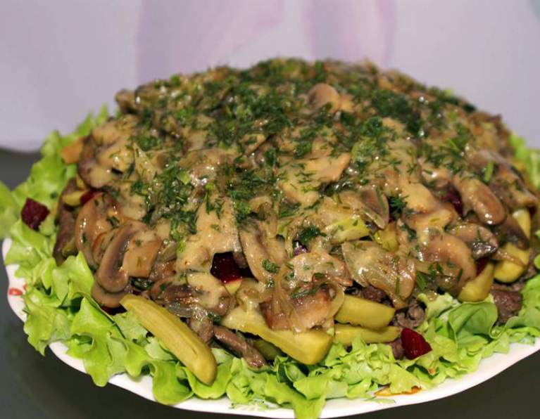 6. Дальше выкладывайте слоями: половину мяса, огурцы, остальное мясо, шампиньоны с луком.