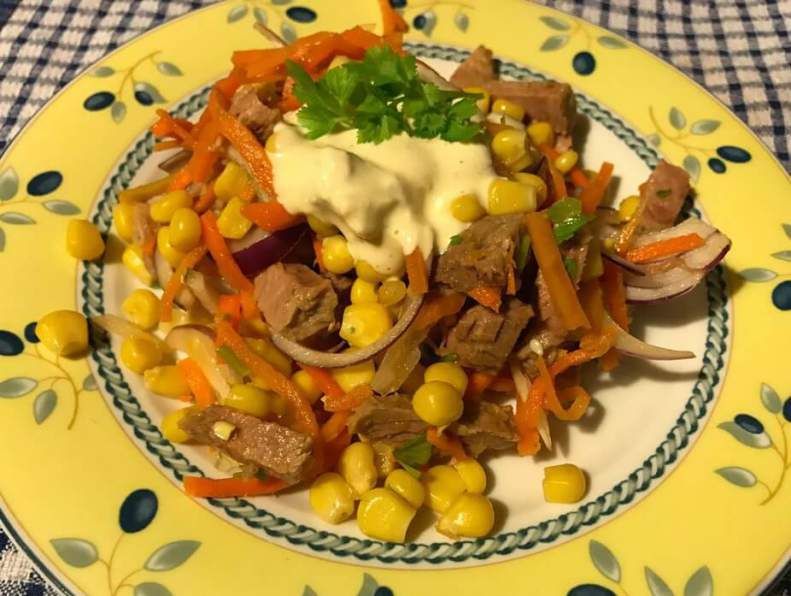 3. В глубокой вместительной миске соедините отварную говядину с корейской морковью, луком, рубленой зеленью, кукурузой.