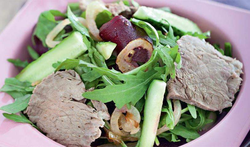 7. Выложите в салатное блюдо руколу, свеклу, огурцы и лук, приправьте солью с перцем и перемешайте. Сверху на положите кусочки говядины и полейте остальным маслом. Салат из говядины со свеклой готов к подаче.