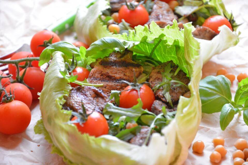5. В листья салата айсберг, как в мисочки,уложите на дно по горсти рукколы, насыпьте отваренный нут, разложите обжаренные кусочки вырезки. В каждую «мисочку» добавьте по 3 вымытых помидорчика черри (можно с чашелистиками) и несколько листиков базилика.
