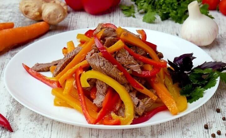 5.В глубокой миске соедините бланшированную морковь, телятину, сладкий перец и перемешайте. Полейте приготовленный салат заправкой и снова аккуратно перемешайте.
