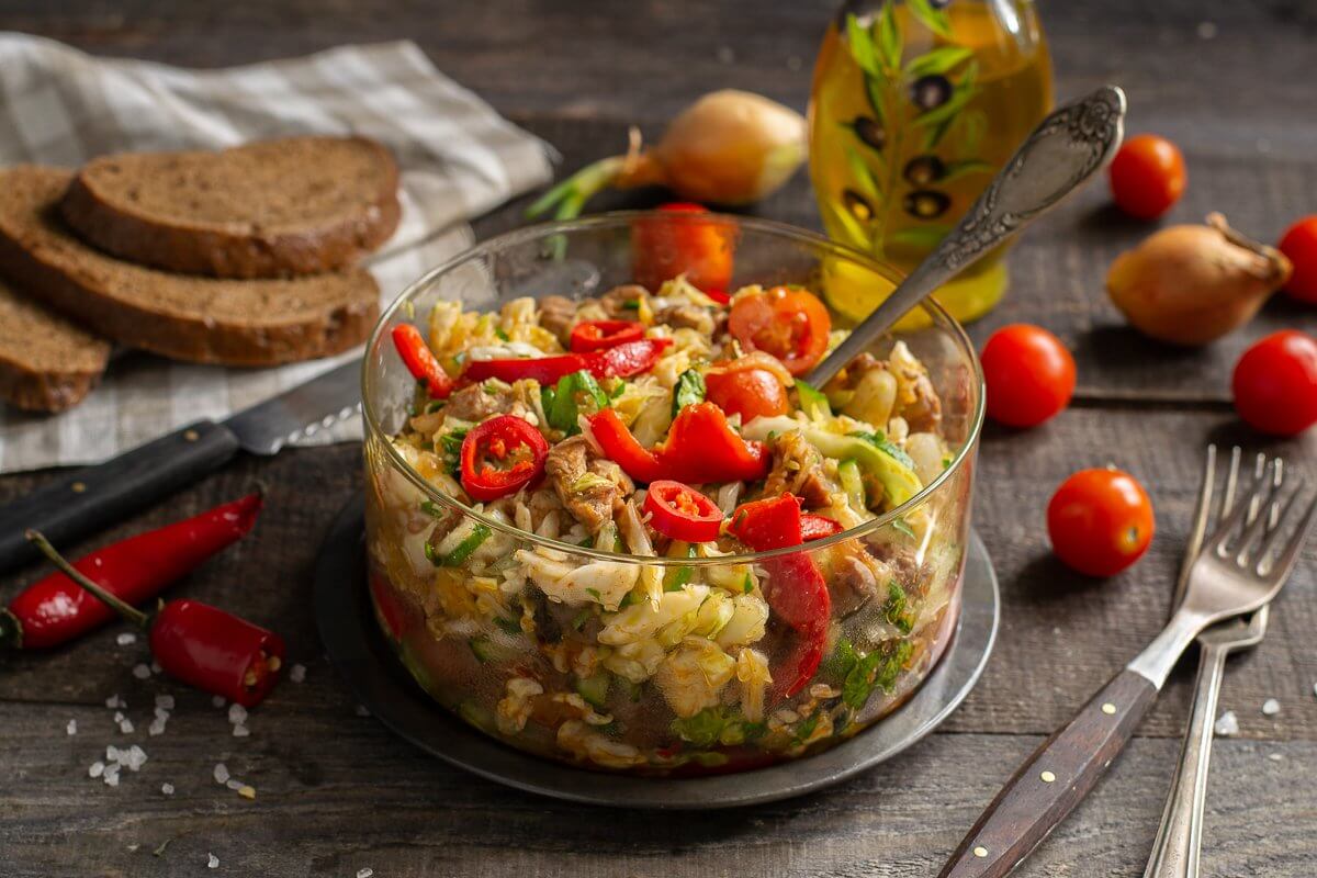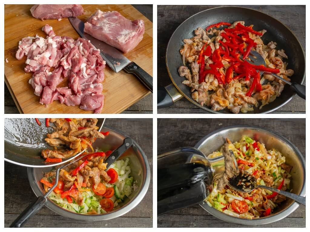6.Добавьте капусту в миску с овощами вместе с половинками помидоров черри и острым перцем, нарезанным колечками. Выложите в миску тёплое свиное мясо вместе с соками и оливковым маслом со сковороды.