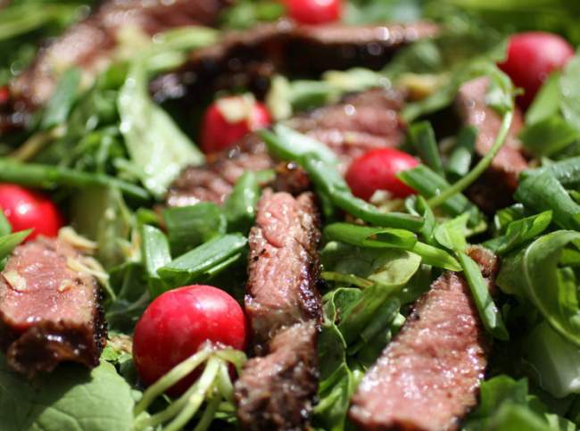 6. Кусок мяса поджарьте на гриле, посыпав солью и вашими любимыми специями. Приготовленное мясо нарежьте поперек волокон на куски около 1,5 см толщиной и разложите сверху на зелень.