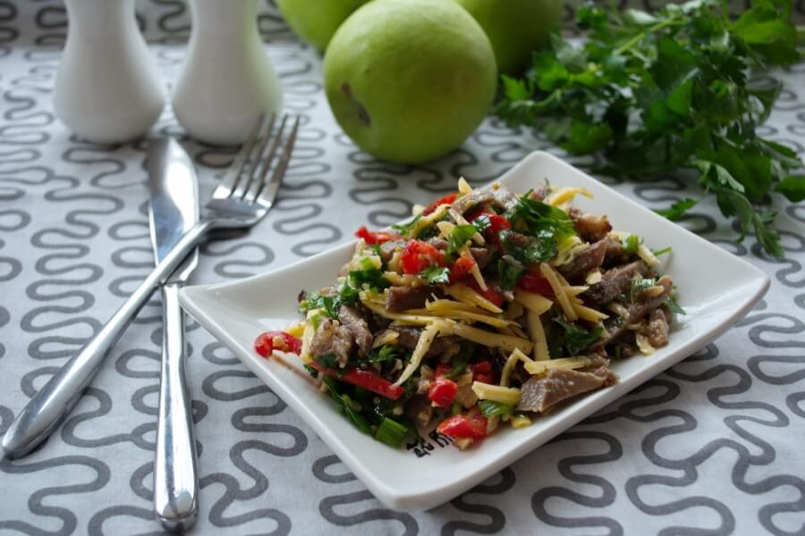 7.Салат с говядиной и сыром подавайте к столу сразу после приготовления. Оставшуюся заправку перелейте в соусник и подайте вместе с салатом.