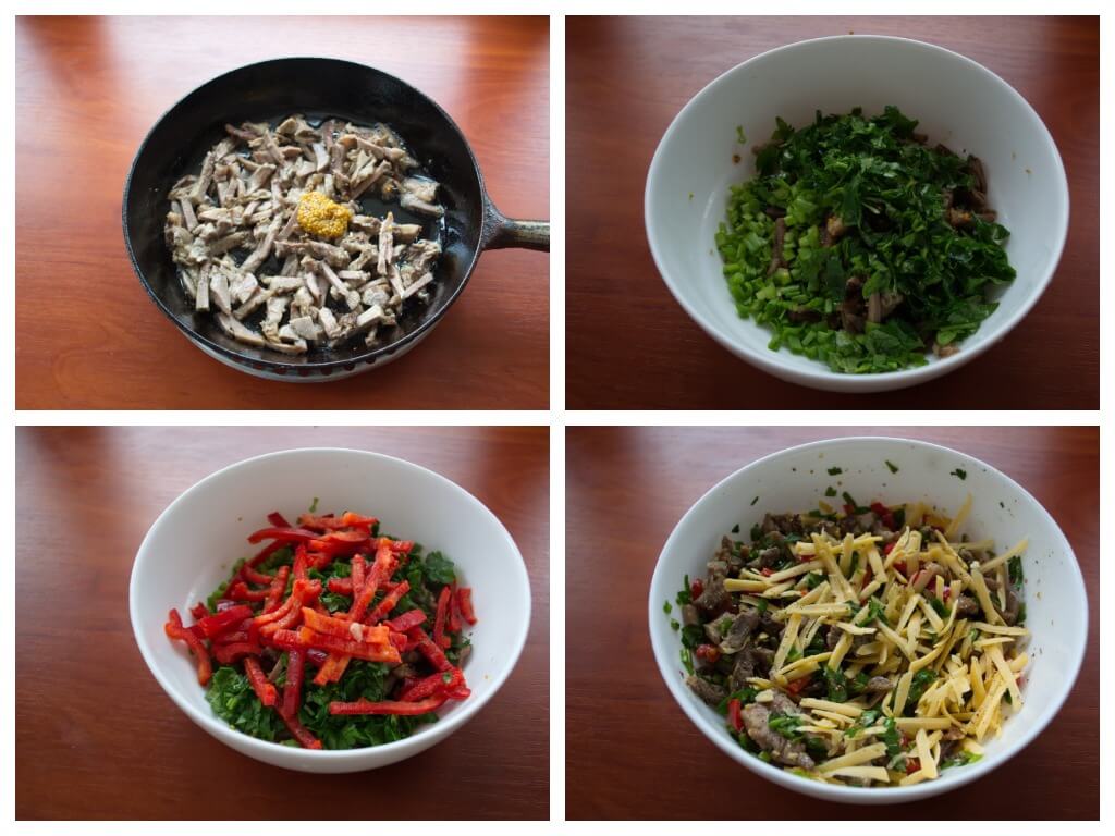 3.Зеленый лук и зелень петрушки вымойте, обсушите и мелко нарежьте. Добавьте измельченную зелень в миску с нарезанным мясом. Сладкий перец разрежьте пополам, удалите семена, нарежьте тонкими полукольцами и добавьте в миску.