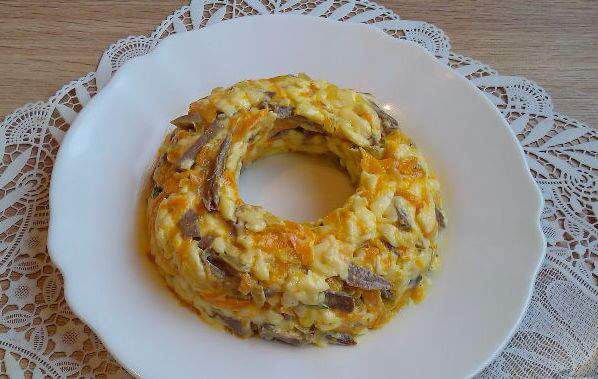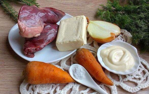 5. В большой миске соедините отварное сердце, тертую морковь и плавленый сыр, поджаренный лук. Добавьте небольшое количество майонеза, щепотку соли и перемешайте. Попробуйте салат на вкус и досолите в случае необходимости.