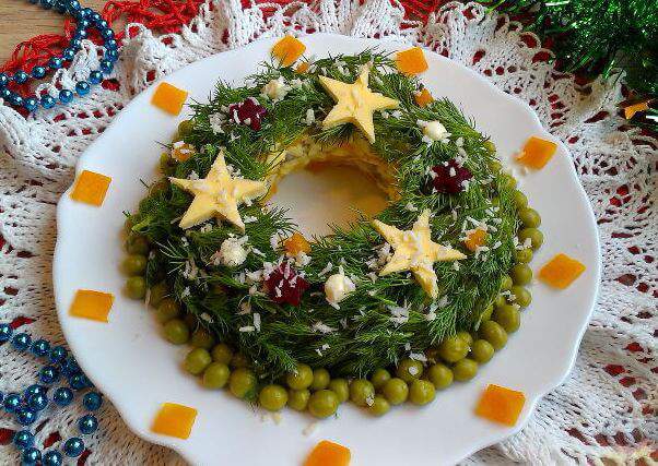 9. Дополнительно можете изобразить «снежные комки» точечками из майонеза. Украсьте подножие венка зеленым горошком, а края тарелки – ломтиками вареной моркови.