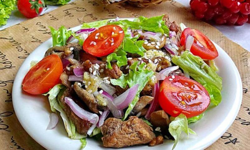 7. Тёплый салат из говядины с шампиньонами под пикантным соусом подавайте к столу, когда мясо и грибы немного остынут. Но и в холодном виде закуска необычайно хороша.