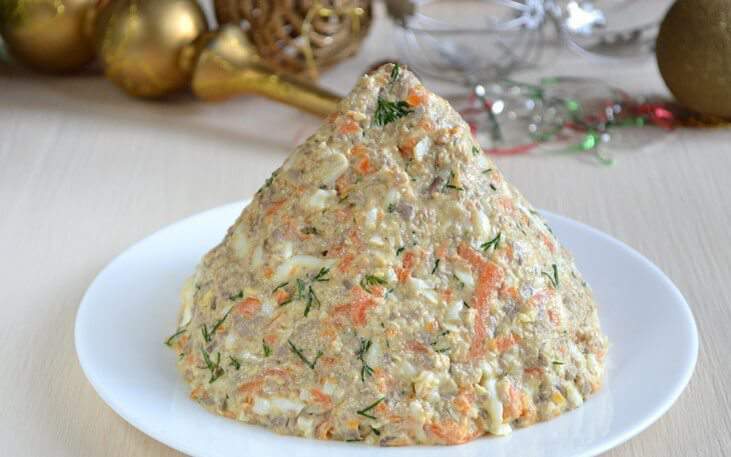11. Новогодний салат «Ёлочка» из куриной печени готов. Подавать на стол можете сразу после приготовления.