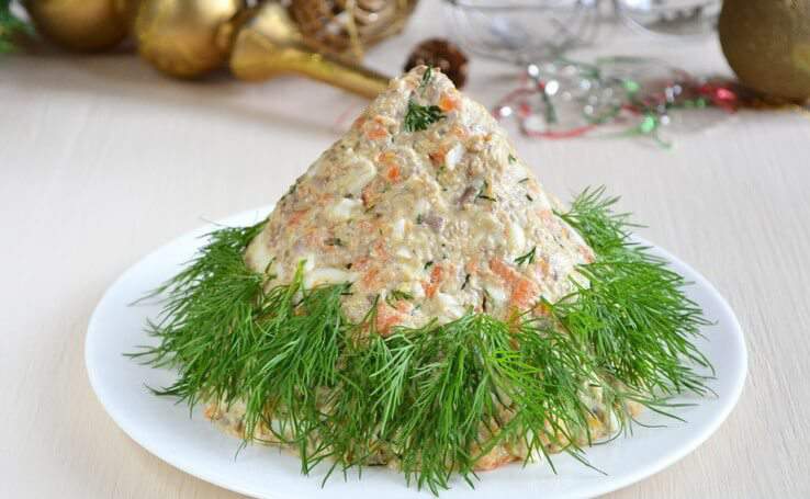 4. Чтобы выложить салат в форме устойчивого конуса, нужно придать ему плотную структуру. Для этого все ингредиенты следует измельчить на средней терке. Вкус салата от такого измельчения не пострадает.