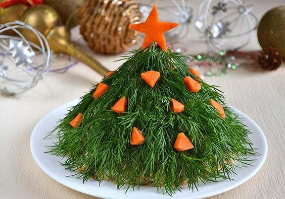 10. Установите звезду на верхушке ёлочного салата, среди веточек зелени прилепите «ёлочные игрушки», окуная одну сторону морковных кусочков в майонез.