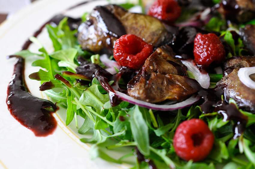 9. Салат с печенью и малиновым соусом – отличное дополнение к обеду, а также идея сытного и легкого одновременно ужина.