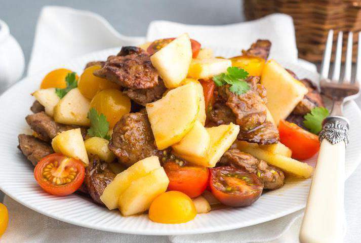 4. Выложите в миску для салата кусочки груш и помидоры черри. Туда же высыпьте поджаренную печень. Смешайте соевые соус с медом и полейте этой смесью ваш салат