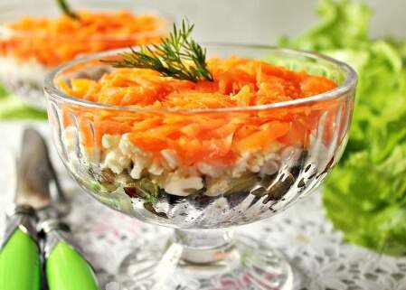6. Смешайте в салатнике поджаренную печень с луком и чесноком, яйца, морковь и огурцы, заправьте салат майонезом. Если вы хотите подать салат с печенью и морковью к праздничному столу, выложите его слоями в следующем порядке: печень с луком, огурцы, яйца, морковь. Каждый слой салата промажьте майонезом.