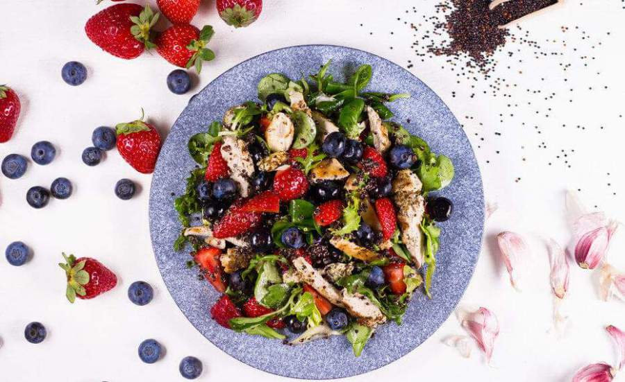 7. Пикантный ягодно-мясной салат с киноа готов к подаче на стол.