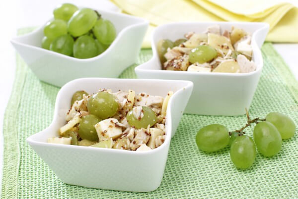 7.Салат из куриной грудки с виноградом и сельдереем переложите в салатник или порционные креманки. Подавайте к столу. Вместо лимонной заправки можете сдобрить салат майонезом или натуральным йогуртом.