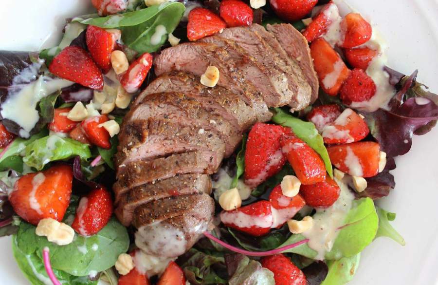 Салат из утиного мяса с клубникой подавайте к столу с соусом горгонзола и лесными орехами.