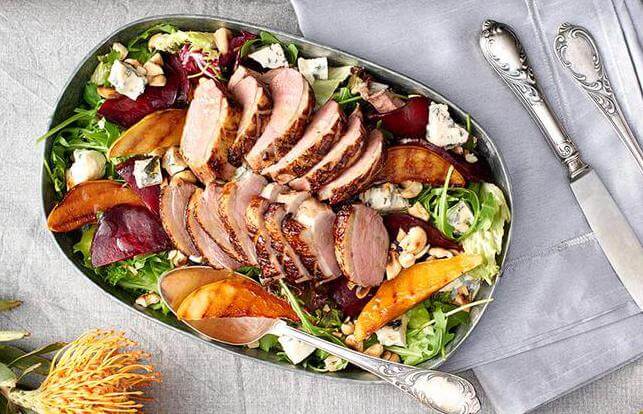 9. На салат уложите нарезанные куски утиного мяса. Салат из утки с грушей и свёклой можно подавать к столу.